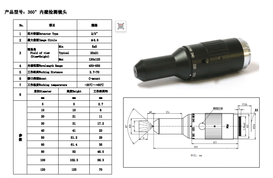 360°内壁环视检测镜头应用于拍摄内孔底部及其垂直内壁,可从外部检测内部,无需将镜头置入孔洞内部,得益于大 视角(82°)和创新的光学设计,这款镜头拥有超大景深,可同时将物体顶部与底部清晰成像。被测物的直径越大,可测量的 高度越高,可拍摄测量物直径:5mm-120mm,测量高度:5mm-123mm。